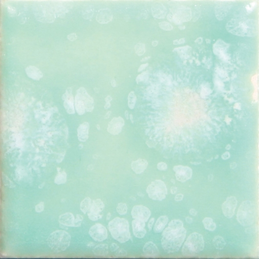 Necaurradzīga baltā pamatglazūra ar zilzaļiem, dzelteniem un violetiem kristāliem.